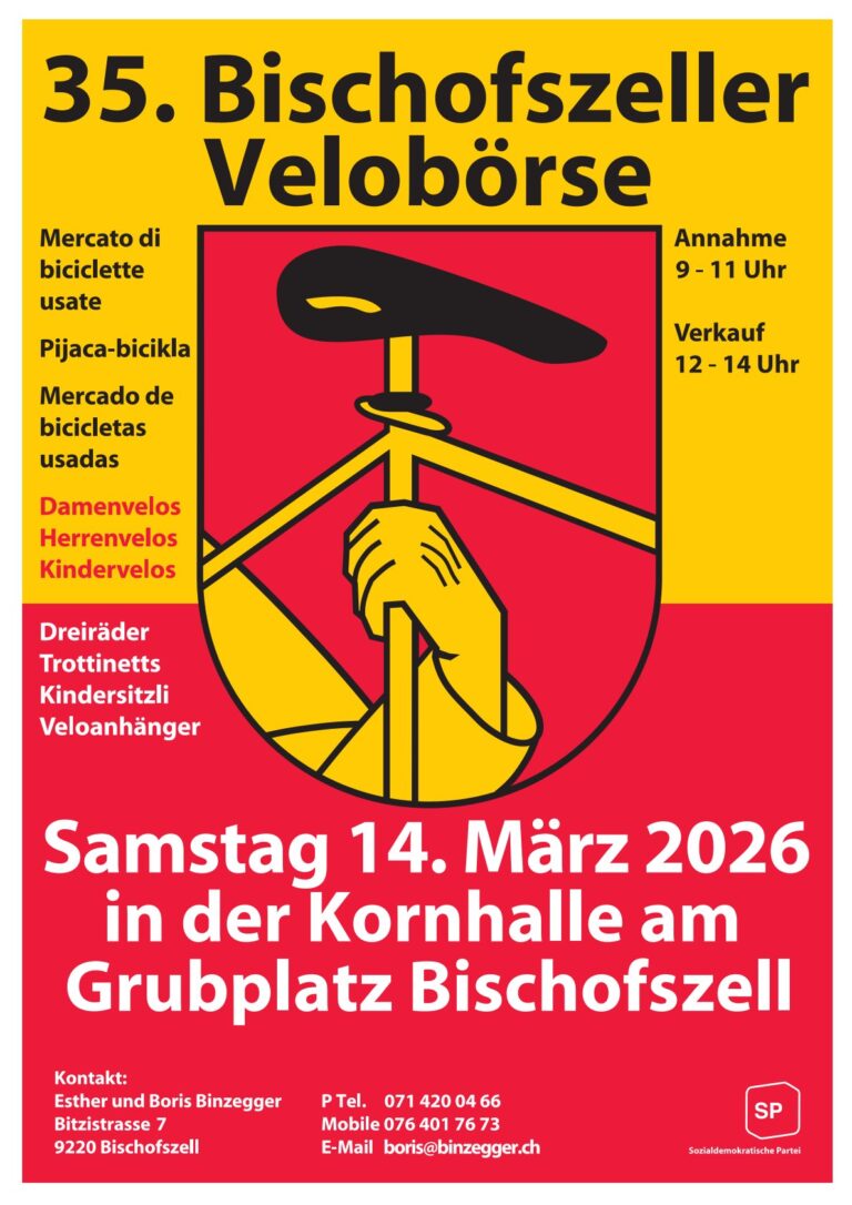 Am Samstag, 22. März 2025 organisiert die SP Bischofszell und Umgebung die 34. Bischofszeller Velobörse in der Kornhalle Bischofszell. 09.00 – 11.00 Uhr: Annahme12.00 – 14.00 Uhr: Verkauf Gleichzeitig betreibt